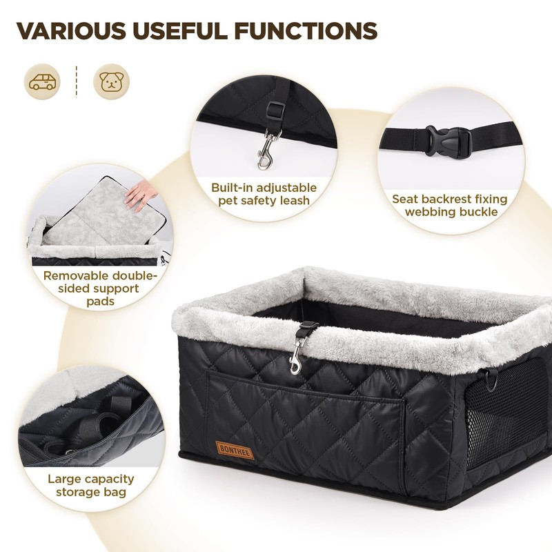 - 🐾【Soft and Durable Material】Our dog booster car seat is crafted from cat scratching cloth.It is not only waterproof, but also effectively prevents pets from scratching. Stains can be wiped off with a cloth and it is durable.The plush rim is filled with soft material for your furry friend to rest their paws.