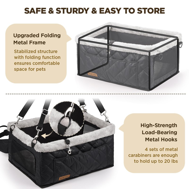- 🐾【Safety-First Elevated Design】 Give your pup the joy of window views while preventing motion sickness! Our booster seat's features (1) Collapsible steel frame with 2 anti-slip anchor straps(2) Dual-layer locking buckle for seat stability(3)Hidden storage pockets hold treats/poop bags. Foldable to 3" thick for trunk storage.