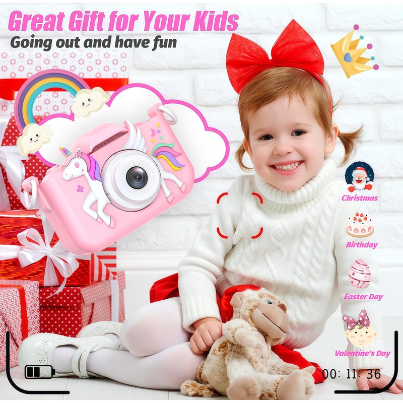 - 【Upgraded Kids Camera Specially Design for Kids】Upgraded to dual-camera configuration, Easy to take selfies. The cute cartoon soft silicone case provides the kids camera with nti-drop design, allows kids to enjoy happy and freedom photography moments without worries of broken. The camera for kids also specially designed a durable lanyard for portability, children can hang the camera on their neck, makes it easy to use in outdoor.