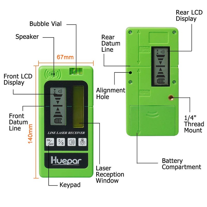 • 【HUEPAR DEDICATED RECEIVER】- Huepar LR-5RG receiver can ONLY use with Huepar Line Laser Level. Please note can NOT be used for Rotary Laser Level. Recommended for use in accompanied with Huepar 901CG/902CG, BOX-1G/R, 8211G, 621CG/R, 622CG/R, 602CG/R, 603CG/R, GF360G/R Laser Level.