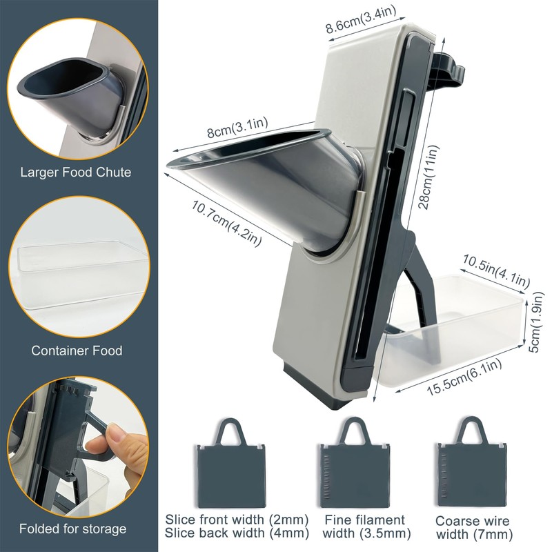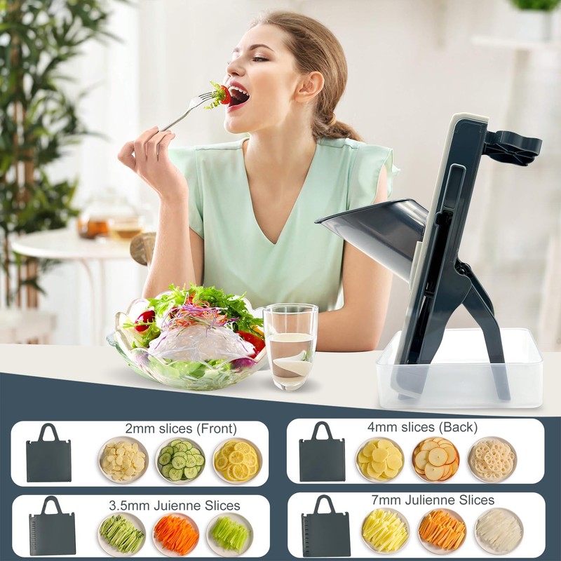 • 【Additional Features】: Comes with a food storage box at the bottom that can be used to store food. The container has a cap to prevent waste of uneaten vegetables and fruits. Includes 2 strip blades, 1 2in1 slice blade, 1 main mandoline body, and 1 food storage box. Also has an adjustable blade, non-slip grips, a handguard for safety, and a large size for efficient food processing. It's a perfect gift for cooking lovers and has a good after-sale warranty.