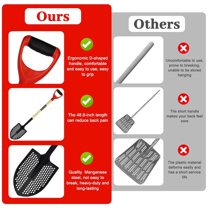 Versatile Use for Multiple EnvironmentsWhether you're cleaning up sand at the beach, sifting through soil in your garden, or dealing with animal waste in a chicken coop, this shovel is perfect for a wide range of tasks. It’s excellent for sifting sand, separating rocks, and cleaning animal droppings from barns or pens. The shovel is also great for treasure hunting, beachcombing, and rock sifting.