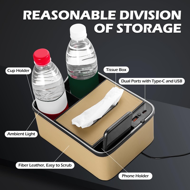 - Car Center Console: The Universal Center Console Organizer provides a well-organized storage solution, making the car space more orderly by easily collecting various small items, and bidding farewell to clutter. The integrated cup holder not only holds water cups but also has space for a tissue box.