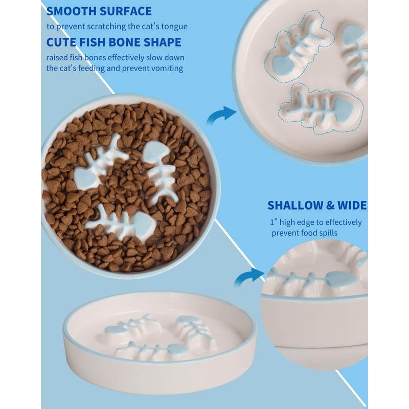 - [Slow Down Eating] The fish bone protruding from the middle of the plate can effectively slow down the cat's eating speed and the elevated design of the bowl aid in better digestion by aligning the cat's mouth with its stomach, reducing the occurrence of vomiting and stomach discomfort.