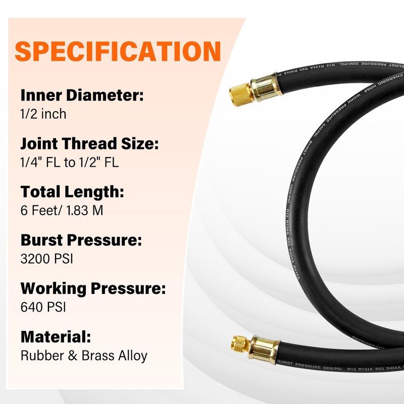 - Fast Recovery and Evacuation: 1/2" large inner diameter design enables faster flow rates, significantly improving system vacuuming and refrigerant recovery efficiency. Burst pressure 3200 psi, working pressure 640 psi. Suitable for medium-temperature refrigerants