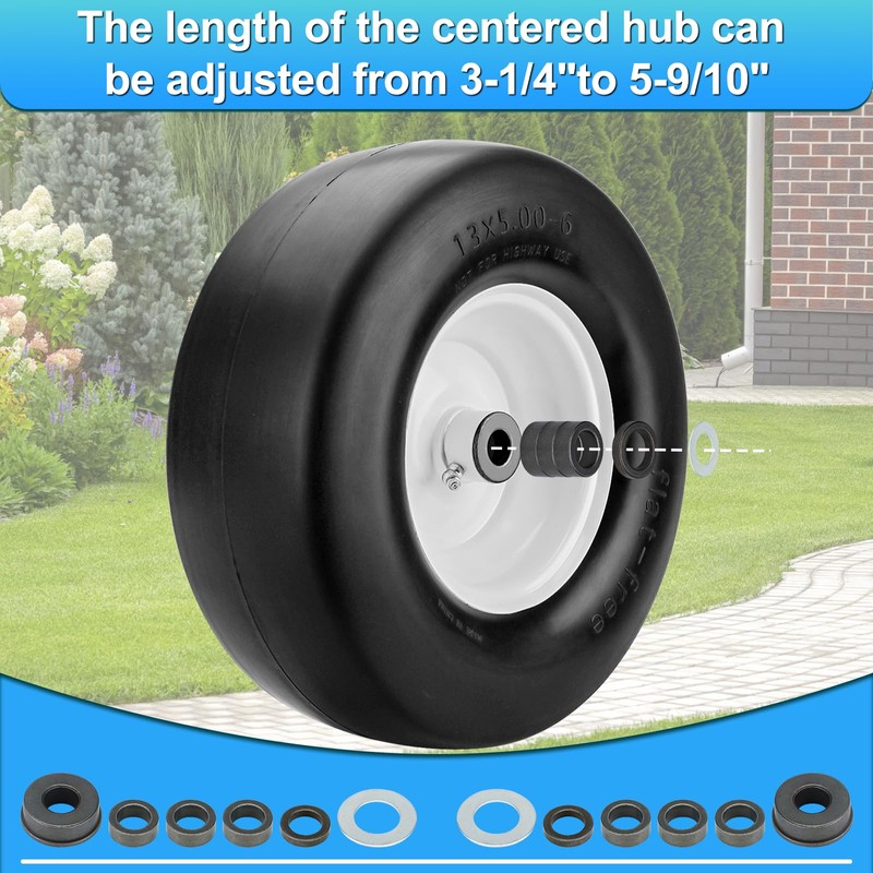 - 【3.25"-5.9" Adjustable Centered Hub】 :13x5.00-6 flat free tire and wheel with universal 3/4 inch shaft holes. Considering that the wheel and bearing sizes of different Lawn mower are different, we provide 4*5/8" bushings, 12*11/25"and 4*6/25" metal spacers, these assemblies help us mount the tires, To accommodate different mowers with center hub lengths of 3.25"-5.9"inches