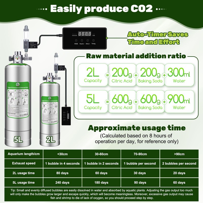 - Things to Note Before Purchase -- (1) The motorized valve may make a soft sound when turning on/off — this is normal and not a fault. It runs quietly during normal operation;(2) Soak the diffuser in your aquarium for 24 hours before use. If bubbles aren't released right away, wait briefly due to low initial air pressure. If problems continue, check tube connections for leaks;(3) The motorized valve is not waterproof. Avoid contact with water to prevent damage;(4)Baking soda and citric acid are not included and need to be purchased separately;(5) For any issues, feel free to contact us — we're glad to help!
