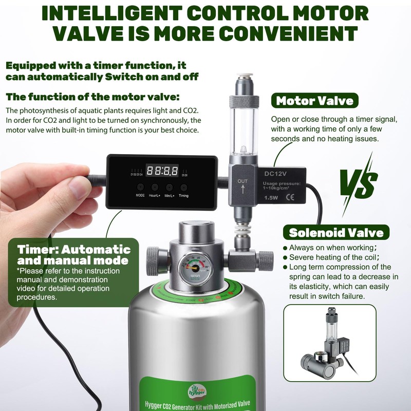 - Revolutionary Motor Valve Technology -- Upgrade your aquarium setup with our advanced CO2 generator system featuring a state-of-the-art motor valve. Unlike traditional solenoid valves, our motor valve allows you to set precise timers, ensuring consistent CO2 injection at your desired intervals. This exclusive feature sets our CO2 system apart from competitors, providing unparalleled control for optimal plant growth.