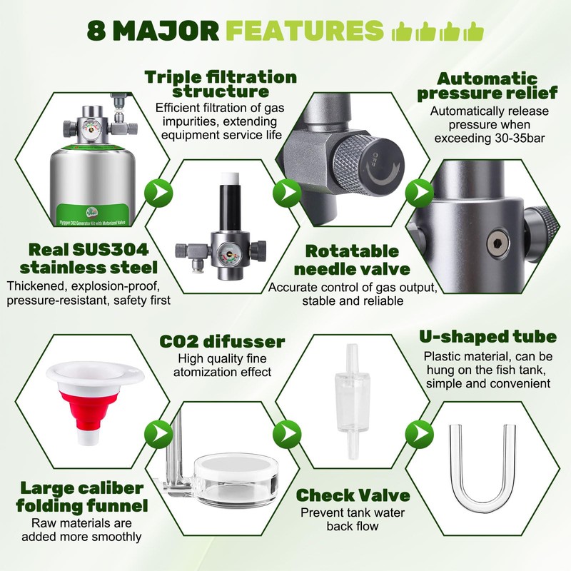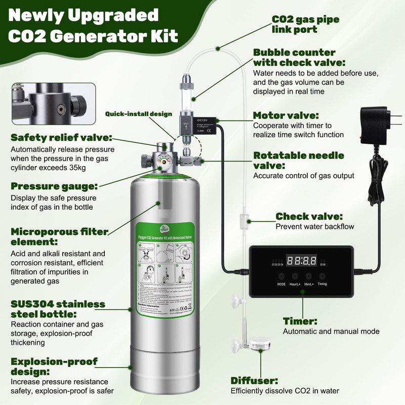 - Comprehensive Safety Features -- Your safety is our priority. An automatic pressure relief valve activates when CO2 pressure exceeds 30-35bar, safeguarding your aquarium from overpressure risks. With careful design and quality materials, we've minimized potential leakage points, ensuring a secure operation environment for your aquarium and its inhabitants.