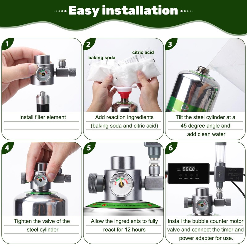 - All-In-One DIY Kit -- Our CO2 generator for aquarium plants comes as a complete kit. It includes a CO2 cylinder, hose, suction cups, bubble counter, CO2 diffuser, and the innovative motor valve. Simply add baking soda, citric acid, and water to the cylinder, close the valve, connect the accessories, and start providing your aquatic plants with the CO2 they need.