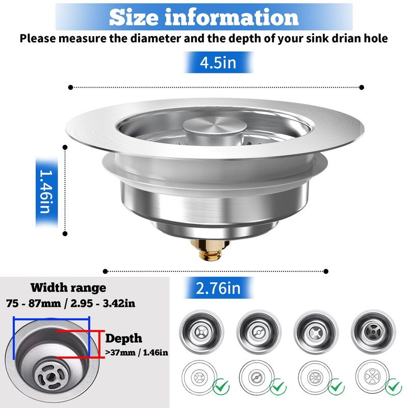 • 【Universal Kitchen Sink Strainer】Designed to be compatible with standard American 3-1/2 inch drain holes, it fits openings with a width of 2.95"-3.42" and a depth greater than 1.46". Our kitchen sink drain has been professionally tested to meet universal American standards. Please measure your sink's dimensions before purchasing and refer to our size chart.