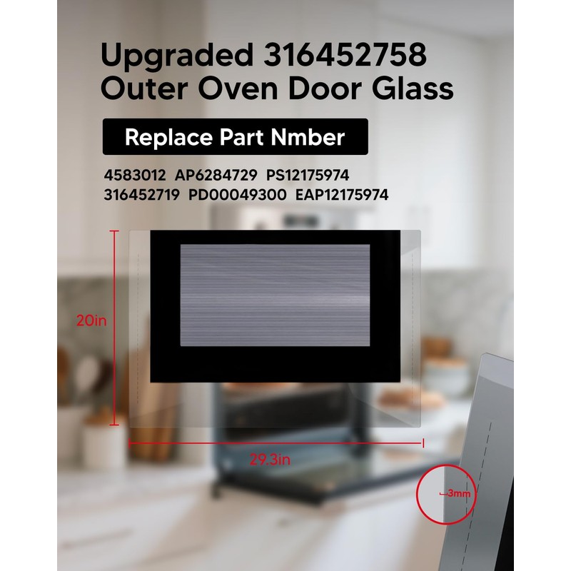 - Perfect Size: Outer oven door glass size is 29.3"(L) x 20"(W) x 3mm(T). Fit for Frigidaire Crosley Kenmore, replace part number 4583012 AP6284729 PS12175974 EAP12175974 316452719 PD00049300, please check your oven model/part number before purchasing