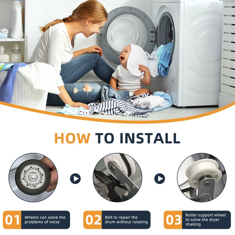 - [EASY FIX FOR COMMON ISSUES]: This dryer replacement part kit easy to fixes many dryer problems such as dryer is noisy, will not tumble, leaves marks on clothes, or will not start etc.4581El2002C Dryer maintenance kit make your dryer run more smoothly and quietly. Easy to install, saves your time and money from expensive repairs.