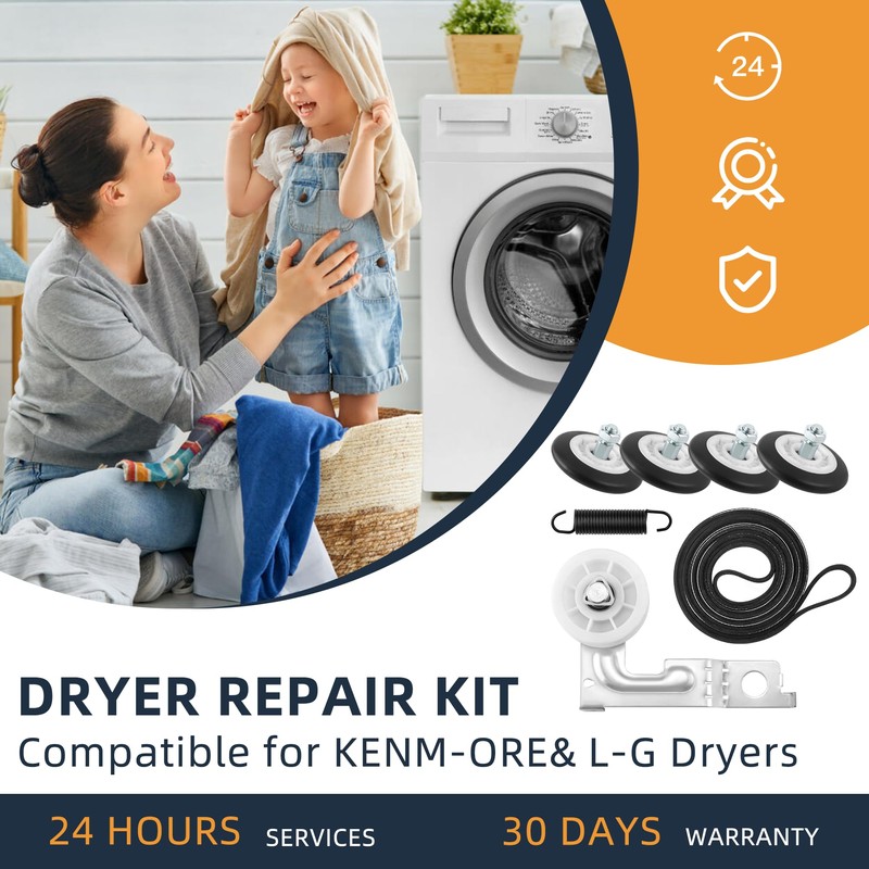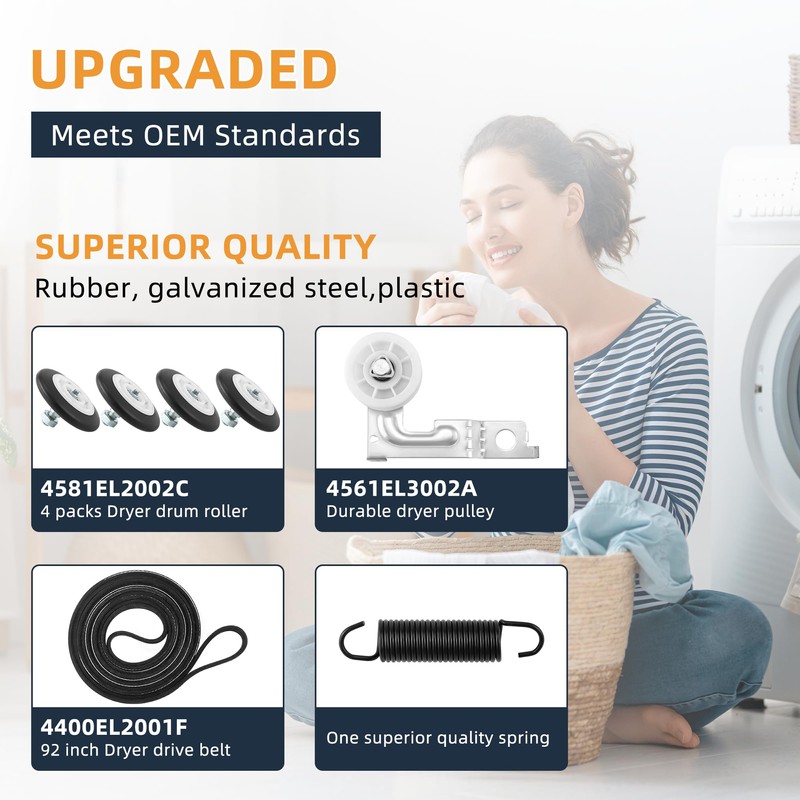 - [DRYER REPAIR KIT INCLUDES]: 4 pc 4581EL2002C dryer drum roller with nut and axle shaft assembly, 1 pc 4400EL2001F dryer drive belt ( 0.26in WIDTH, 92in LONG) and 1 pc 4561EL3002A dryer idler pulley assembly ( include 1 spring) keeps tension on the dryer belt.4581El2002C Dryer idler pulley kit compatible for most of l-g ken-more dryer models.