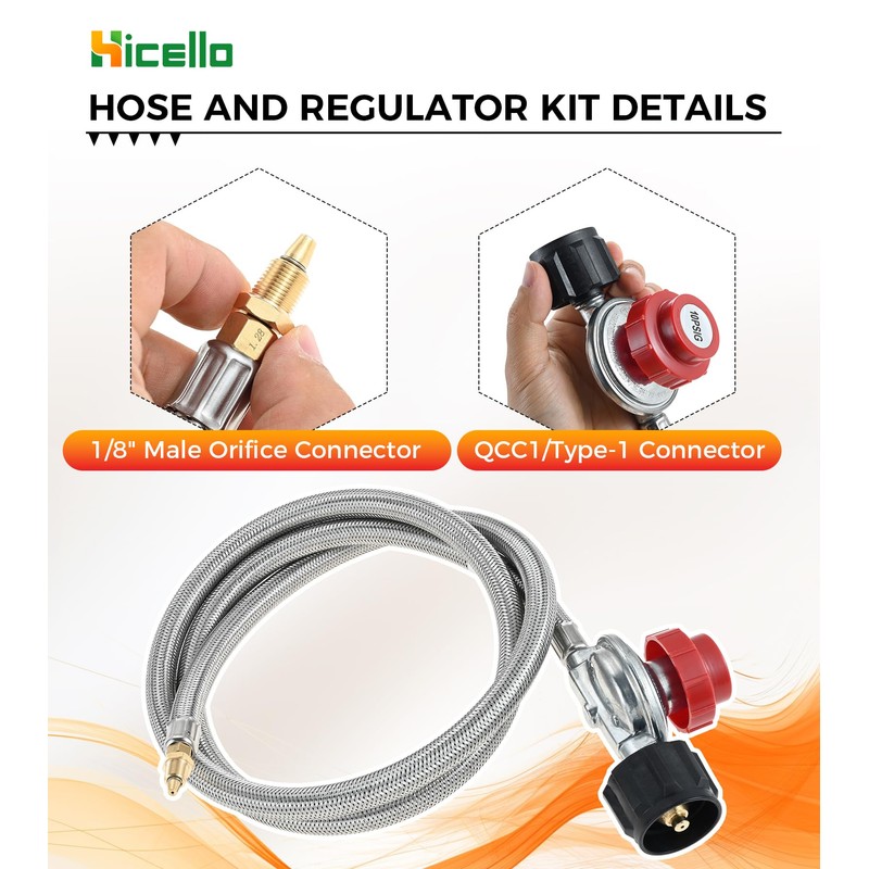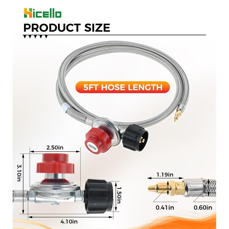 Elevate your outdoor cooking experience with the Hicello 5FT 10 PSI Adjustable High-Pressure Propane Regulator with Stainless Steel Braided Hose — a professional-grade gas regulator designed to meet the demands of high-BTU burners, turkey fryers, fish fryers, fire pits, and more.
