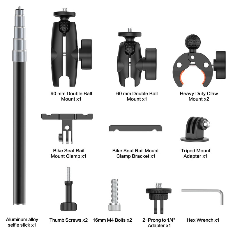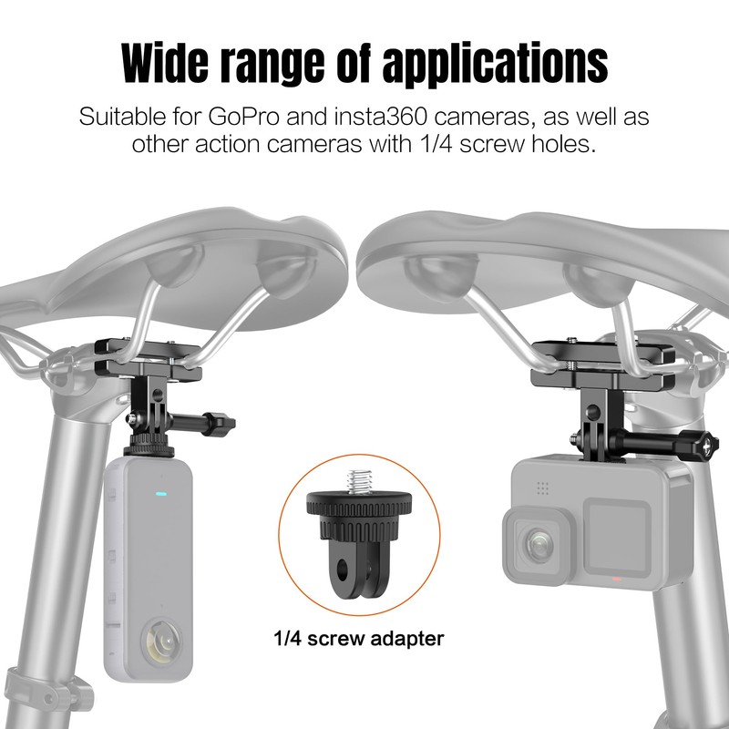 - UPGRADED BIKE TAIL MOUNT KIT: Our upgraded aluminum bike tail mount kit is designed compatible with Insta360 X5 X4 X3 X2X ONE RS R Go 3S Ace Pro, GoPro 13 12 11and more action cameras, and the new design mounts under the seat and on the rear of the bike to provide stable, high-quality video while you ride your road cycling and make sure your video doesn't shake. The mount can be securely fixed on various models, including motorcycles, mountain bikes, or road bicycles, making your ride records more vivid