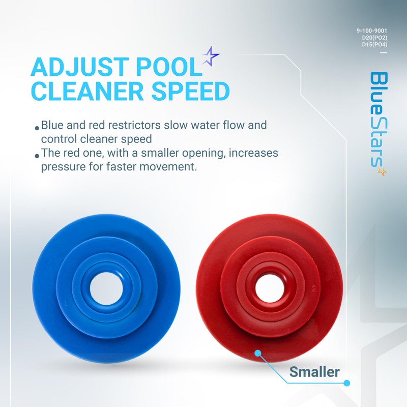 The 9-100-9001 Pool Cleaner UWF Connector replaces an existing part in your system that screws into the sidewall of your pool. The Blue and Red is Restrictor Disk in order to help water flow restrictor in case the water pressure from the booster pump is too high for the sweeper, so you can choose the level of water pressure by using the blue or the red disk. It takes 2 hose nuts and 1 hose swivel to connect the Pool Cleaner Hose Swivel D20 and the Hose Nut Kit D15. There is an arrow mark on the swivel, make sure that the swivel has to be installed with the arrow in the direction of water flow. To help with the installation, you should get a cup of boiling water and put the hose in it for 1 minute to become flexible in order to put on the swivel easilier.