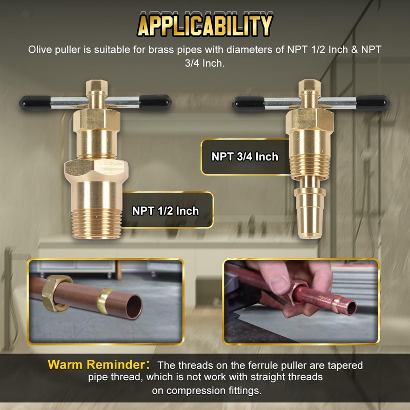 - 【Effective Compression Ring/Ferrule Puller Removal Tool】Ferrule puller is a brass compression ring plumbing puller tool that is suitable for brass pipes with diameters of NPT 1/2 Inch & NPT 3/4 Inches, suitable for a variety of plumbing applications, effectively removes rusted or damaged compression rings, ferrules (aka olives), and removes angle stop rings around pipes, as well as removing old shut-off valves under bathroom sinks, etc., saving pipes and making valve replacement easy.