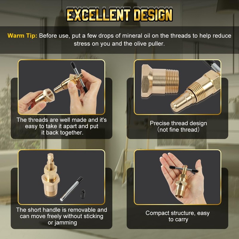 - 【Upgraded Model - Hexagonal Head Design】 Compared with most olive pullers on the market, the head of this olive puller adopts a hexagonal design, which can be used with a ratchet and a socket, and can also be installed with an power drill to drive the olive puller, the design provides great convenience for tight space situations or people with limited grip strength. Additionally, you can remove the included short handle and use a screwdriver or other longer rod to gain more leverage.