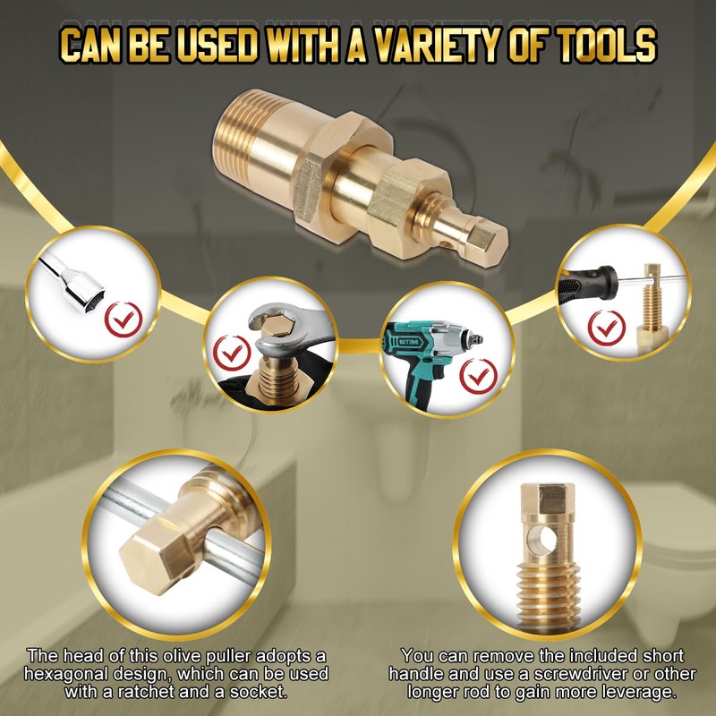 - 【Well Made & Compact Structure】The design of the compression ring removal tool ensures precision and ease of use. It is made of high-quality solid brass with well-made threads, high strength/hardness, sturdy and durable, and has good corrosion and wear resistance. The olive puller features premium construction and compact size, and the handle and threads move freely without sticking or jamming. Small enough to hold in one hand, it works great even in very tight spaces.
