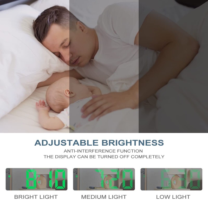 - 【ADJUSTABLE BRIGHTNESS】Just press UP/DOWN to adjust the three levels of brightness (Bright/ Medium /Low). Besides, the bedside alarm clock will auto dim during 18:00-6:00 when in the night mode, or you can set another periods of time for your need. Just press and hold the snooze button for more than 3 seconds to turn off the display to prevent the screen from lighting up at night to interfere with sleep. (NOTE: If you use a cable for power supply, the clock will always be on.)