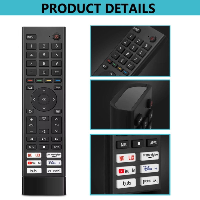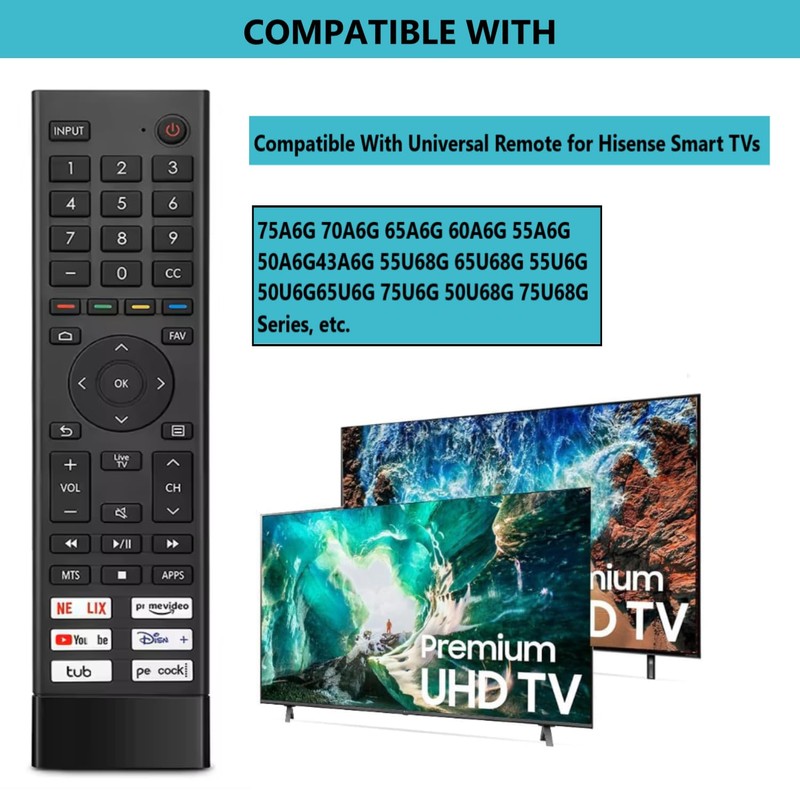 - Replacement remote control is suitable for Hisense smart TV models, including 75A6G 70A6G 65A6G 60A6G 55A6G 50A6G 43A6G 55U68G 65U68G 55U6G 50U6G 65U6G 75U6G 50U68G 75U68G.