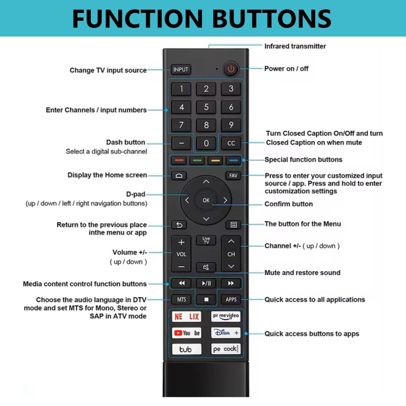 - The Universal infrared remote features six shortcut buttons for Netflix, Prime video,YouTobe,Disney,tubi,peacock.One click to your favourite TV Chanels.
