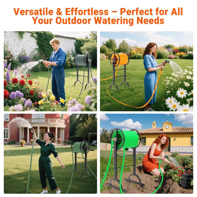 - 【Large Capacity & Easy Assembly】Holds up to 200FT of 5/8" hose - perfect water hose holder for gardens, lawns & patios! This heavy-duty hose reel features tool-free assembly and smooth handle-operated retraction for tangle-free storage. The upgraded design makes watering, car washing and outdoor cleaning effortless while keeping your space organized. A must-have for tidy homeowners