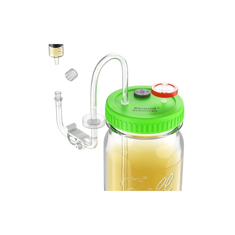 • A luer lock is available for a screw on connection to any luer lock syringe. Standard Mason Jar lid equipped with a .22 micron syringe filter to supply filtered air intake while media is extracted from the bottle via silicone tube on the floor of the vessel.