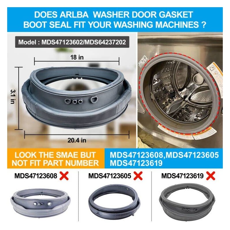 - ✅【Compatible Part Numbers】:MDS47123602 door boot gasket or rubber door boot seal parts replacement for LG,Kenmore washer door gasket or door boot seal part numbers: MDS47123602, MDS64237202, MDS64237201, 529948, AH3535210, EA3535210, PS3535210,AP5218575 ,MDS47123612,(Note: NOT FIT LG MDS47123608 .that appliance parts can look similar in many ways. If you're not sure whether or not a parts you're ordering fits your model, please feel free to contact with us before ordering.)