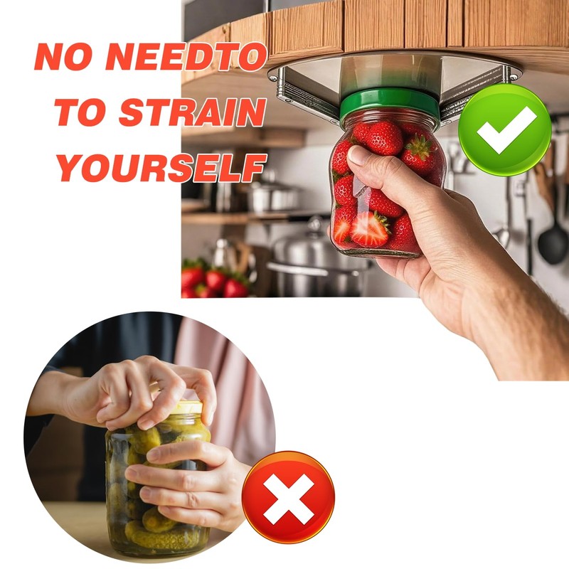 - Space Saving: Save valuable counter space with our under-cabinet mount design. The jar opener is securely installed under your cabinet, always within reach but out of the way, Installation is a breeze with the included three peel-and-stick adhesives and three stainless steel screws, ensuring a secure and easy setup