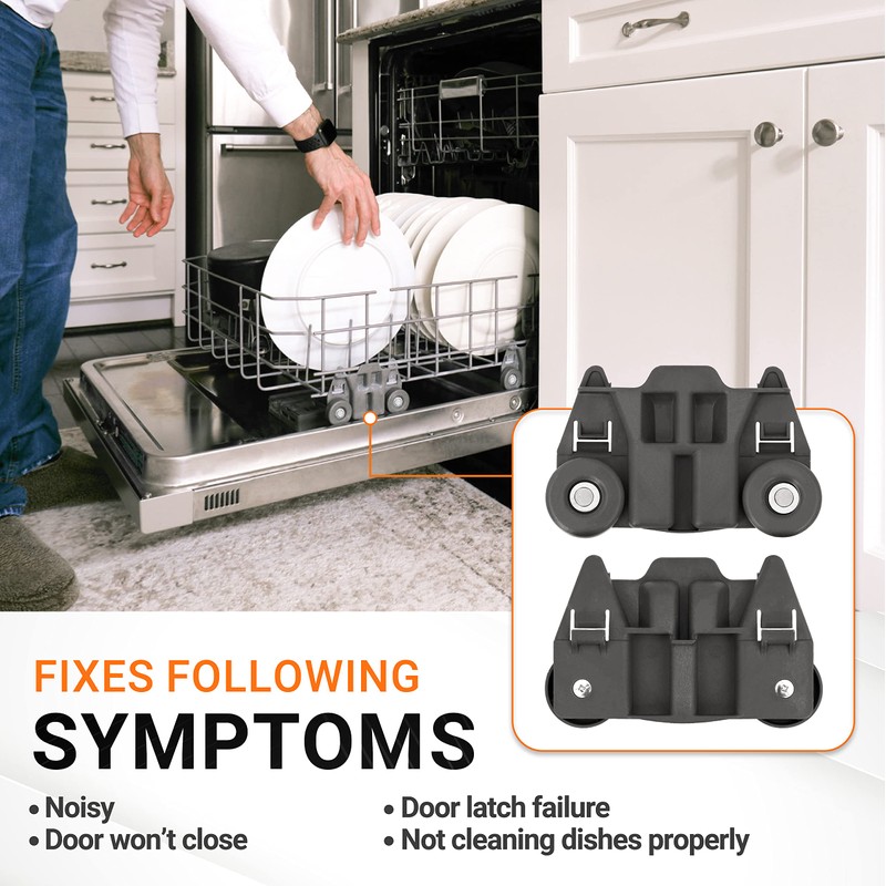 • ✅ EFFORTLESS INSTALLATION: Inexpensive way to fix or repair a dishwasher. To repair, open the dishwasher door and pull out the lower dishrack. Next, push the tab from both sides and it should pop out. To install the new wheel assembly, place it on the rack and make sure the caps overlap the wire from the inside before you clip it in place by pushing the wheel. Slide the rack back into the dishwasher to make sure it is installed correctly.