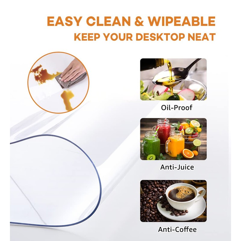 - 🆕【Heavy Duty Tablecloth】1.5mm Thicken Clear Plastic Table Protective Pad is heavy duty and won't move easily. Durable crystal plastic tablecloth is waterproof, oil-proof, anti-coffee, anti-scratch, it is easy to clean and wipeable. The stain can be easily wiped off with damp paper towel or damp cloth. Protect your beautiful and expensive desktop well and keep it clean and tidy. It is a perfect table mat for coffee table, kitchen counter, bar, buffer, dinner table.