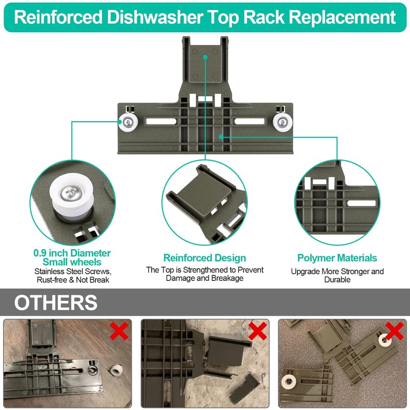 - The updated W10350376 dishwasher top rack parts adjuster is made of advanced new polymer materials which is more robust and persistent than other materials. The complete kit is well-tested by the manufacturer before leaving the factory to ensure safety and longer use, not OEM parts but quality equal to OEM requirements even better. Your concerns about fragility, security and durability will be well addressed