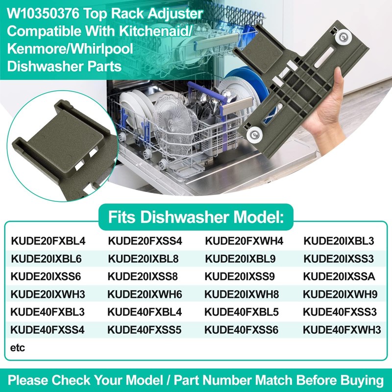 - The updated WPW10350376 dishwasher top rack adjuster kit is fits for Whirlpool Kenmore kitcheneaid dishwasher parts including KUDE20FXBL4, KUDE20FXSS4, KUDE20FXWH4, KUDE20IXBL3, KUDE20IXBL6, KUDE20IXBL8, KUDE20IXBL9, KUDE20IXSS3, KUDE20IXSS6, KUDE20IXSS8, KUDE20IXSS9, KUDE20IXWH3, KUDE20IXWH6, KUDE20IXWH8, KUDE20IXWH9, KUDE40FXBL3, KUDE40FXBL4, KUDE40FXBL5, KUDE40FXSS3, KUDE40FXSS4 KUDE40FXSS5, KUDE40FXSS6, KUDE40FXWH3 etc