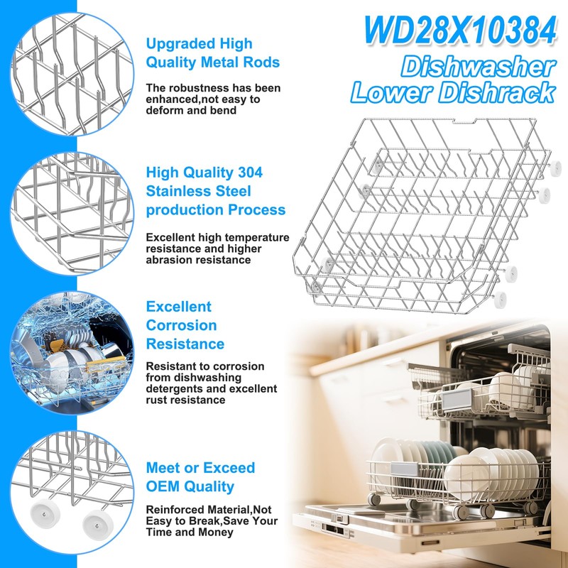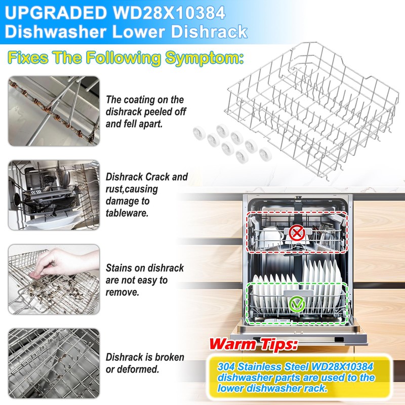 - 【UPGRADED 304 STAINLESS STEEL WD28X10384 GE Dishwasher Lower Rack Assembly】WD28X10384 ge dishwasher rack replacement parts adopts mature 304 stainless steel production process, improved abrasion resistance and excellent high temperature tolerance.The WD28X10384 ge dishwasher replacement parts only fits the LOWER rack.WD28X10384 ge profile dishwasher bottom rack adopts latest 304 stainless steel production technology, better wear resistance and high temperature resistance. The robustness has been enhanced, making it resistant to deformation and bending.The wd28X10384 ge dishwasher replacement racks parts are well tested by manufacturer and meet OEM standard.