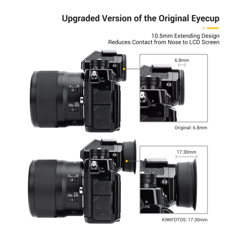 - An upgraded eyecup over the standard camera's original eyecup, its increased depth is nice for blocking more light outdoors, and helpful for keeping nose smudges off the LCD screen