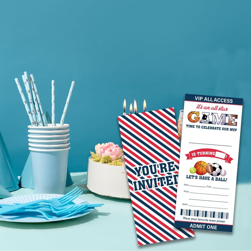 UPNEGE Sport Birthday Invitations Tickets Sport Party Football Baseball Basketball Soccer Ticket Invitations with Envelopes Set of 20