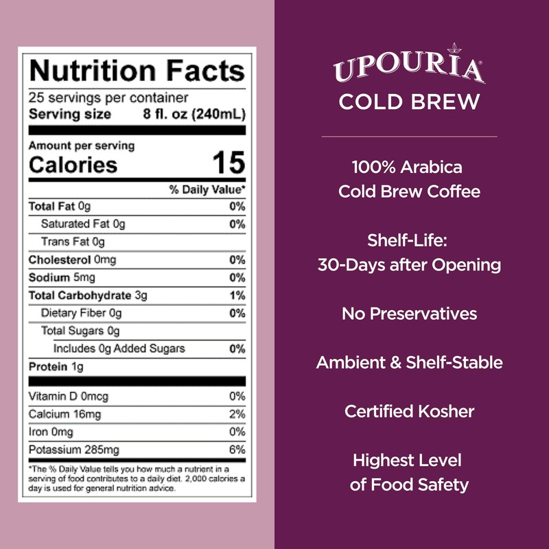 - Premium Quality: Made with 100% Arabica coffee and no preservatives, Upouria cold brew coffee pure taste in every sip. The aseptic packaging ensures long-lasting freshness, making it shelf-stable and ready to enjoy whenever you need a boost. No added sugar, just pure iced coffee & cold-brew goodness.