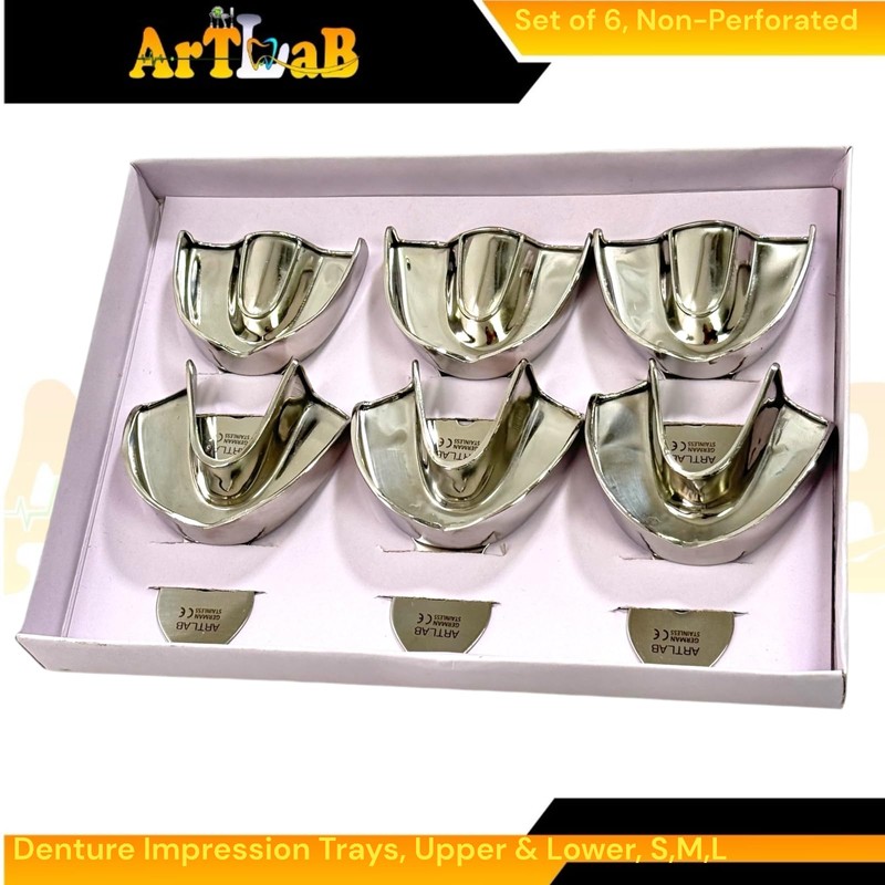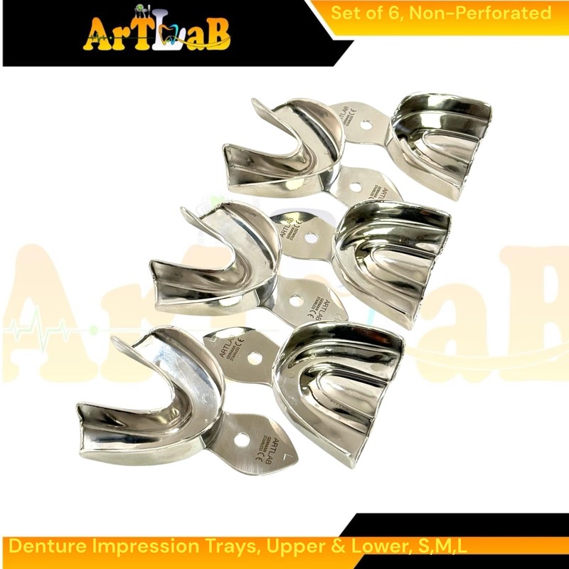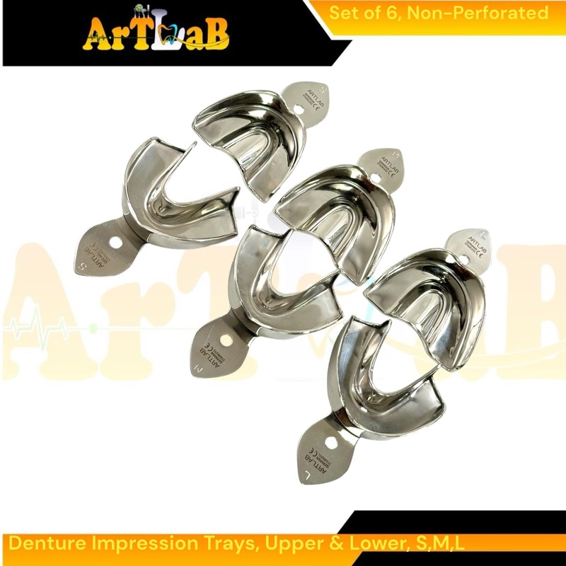 Comprehensive Set: Includes 3 upper and 3 lower trays in small, medium, and large sizes. Material: Made from premium German stainless steel for exceptional durability and longevity. Autoclavable: Can be sterilized using standard autoclave procedures for repeated use. Design: Plain, non-perforated surface for smooth impression material application.
