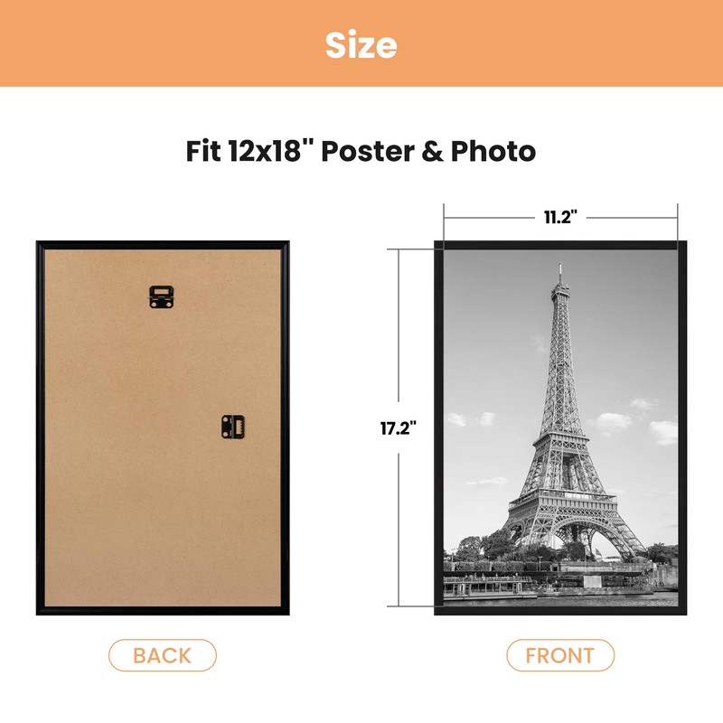 • SIZE: In order to better fix the position of the poster, the display size is designed to be slightly smaller than the 12x18 poster size. With a modern style, 12x18 poster frame is suitable for hanging on any wall in home, office, photo studio, art gallery, school exhibition hall.