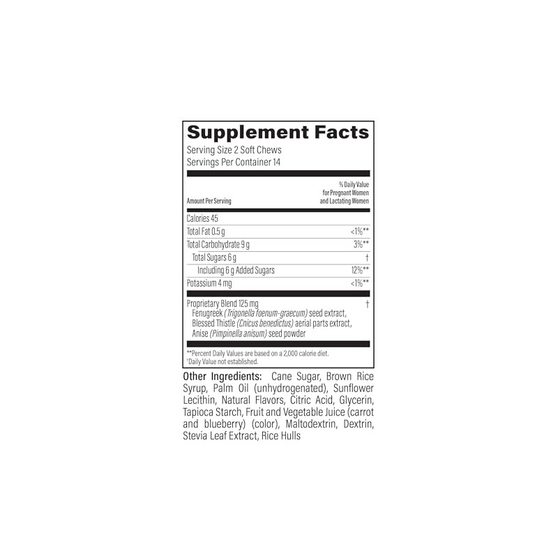 - Healthy Ingredients & Quality Assurance: Milkflow soft chews feature a proprietary blend of Fenugreek and Blessed Thistle, crafted in an NSF & GMP certified facility in the USA and rigorously tested by a 3rd party lab to ensure the highest quality and safety.