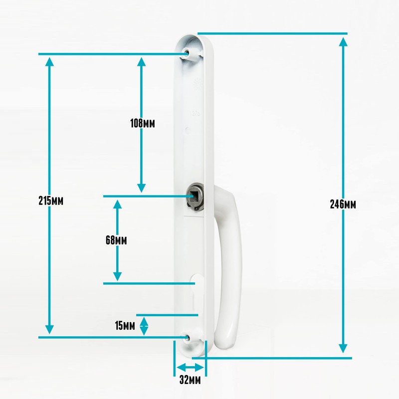 - Measurements - 215mm from Screw to Screw - 245mm x 32mm Backplate - 68mm PZ (Centres) From Centre of Keyhole to centre of Door Handle Spring - Please check these crucial measurements to ensure these Handles are suitable for you. Full Measurements are in the line drawings in the images.