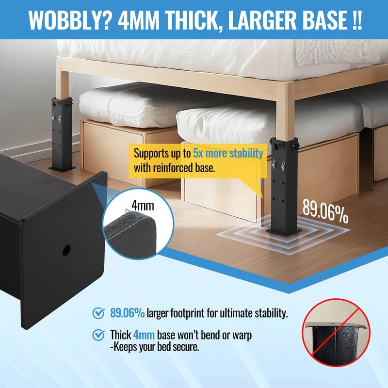 - : Our larger metal base offers a greater surface area, reducing the risk of your bed riser tilting or becoming unstable under concentrated weight. The 4mm thick metal base is resistant to bending or deformation, ensuring your bed remains secure and steady.