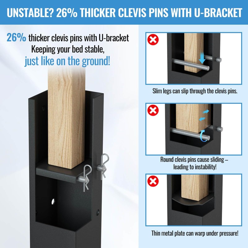 - % : Unlike other bed lifters on the market, we use heavy-duty steel that's at least 32% thicker. We've also increased the diameter of the clevis pins by 26% and paired them with a robust U-bracket. This ensures your bed legs stand firm, as if they were on solid ground.