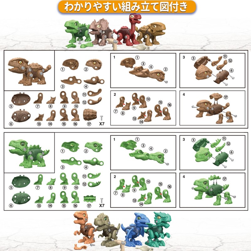 - Super Luxurious, Large Capacity Set: Dinosaur toy (8 types of buildable types), electric drill (made of ABS material, please purchase 2 batteries separately), simple screwdriver (ABS plastic), Japanese instruction manual x 1 (English language not guaranteed) (English language not guaranteed). ) 1 x High quality storage box (convenient to carry and easy to clean) A cool dinosaur toy that can be assembled by yourself! A screwdriver or screw lover will get this item