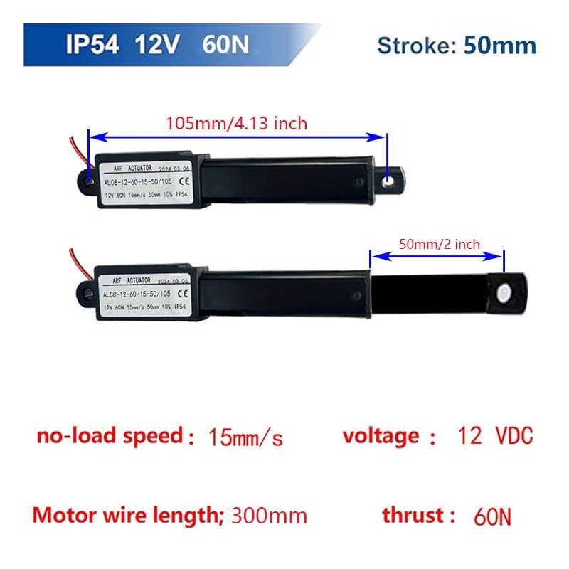 • 1.Mini 12V linear actuator specifications: Stroke length :2 inches /50mm,maximum load capacity :60N/13.4lbs,input voltage :12VDC,IP54 protection level,low noise ≤50,ambient temperature :+5℃~+40℃