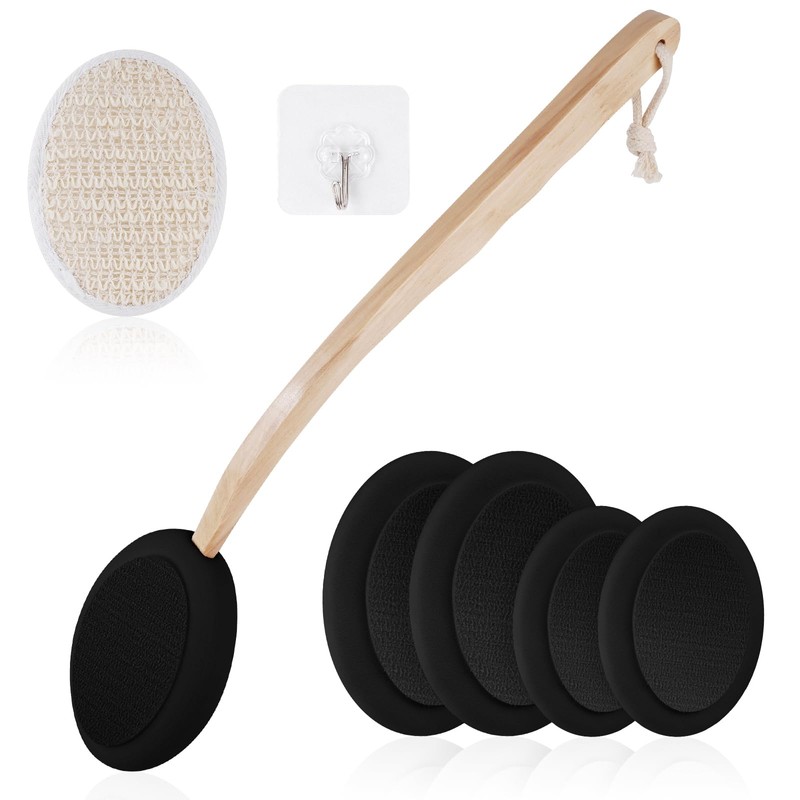 - Verpackungsliste: Ein Set mit 7 Teilen, darunter 2 Schwarz große Applikatorbürstenköpfe, 2 Schwarz kleine Applikatorbürstenköpfe, 1 Holzgriff, 1 transparenter Haken, 1 Badebürste aus Baumwolle und Leinen für den Eigenbedarf oder für Familie und Freunde