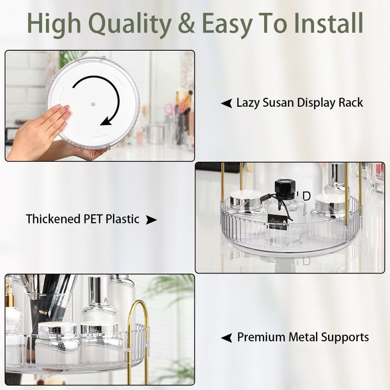 2. Easy to Disassemble and Assemble The rotating display stand is made of sturdy PET plastic with sturdy gold metal brackets to prevent your items from shaking or umning, making it sturdy and durable. The installation of the perfume organizer requires no tools, just insert the metal holder completely into the hole next to the tray.