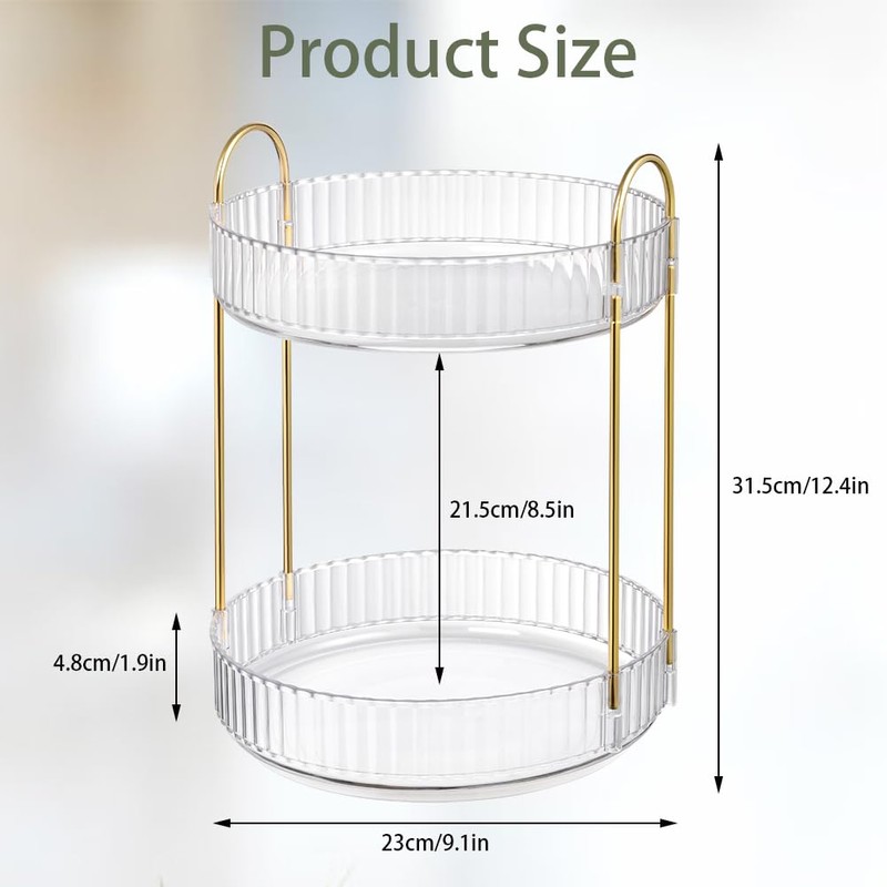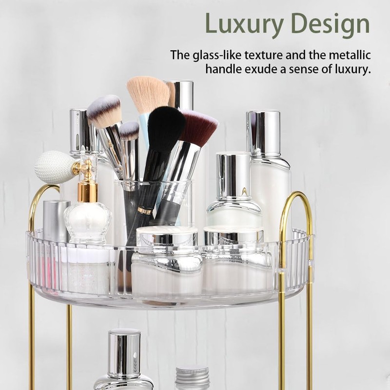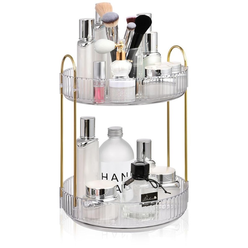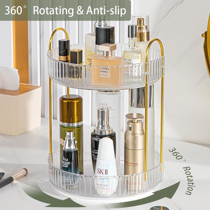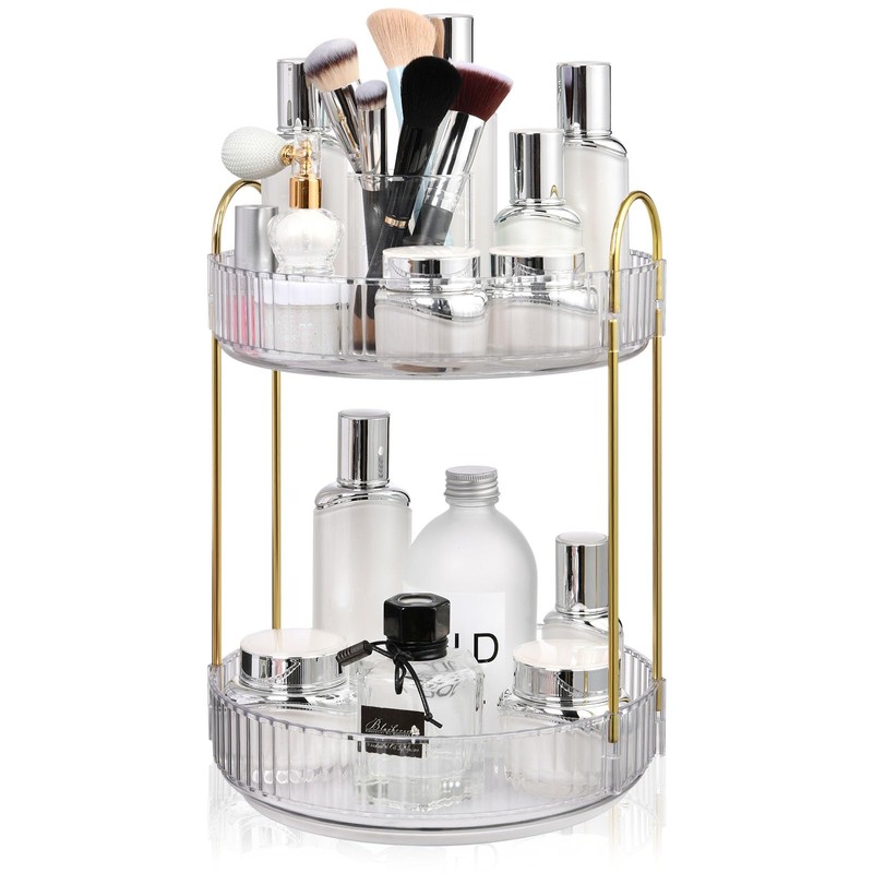 1. Adjustable Large Capacity Design The rotating cosmetic rack supports e assembly and adjustment and individual storage according to your needs and preferences. The three-tier rotating shelf can be detached into two levels and a single level, with two levels for skin care products and a single tier for decorative items and/or perfumes to meet your different storage needs.